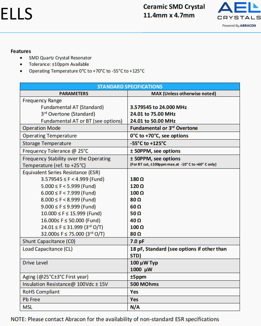 ELLS-12.000MHz-18-R60-A-4-F-T | AEL Crystals | ELLS | 12 MHz | ±50ppm | ±30ppm | 18 pF |