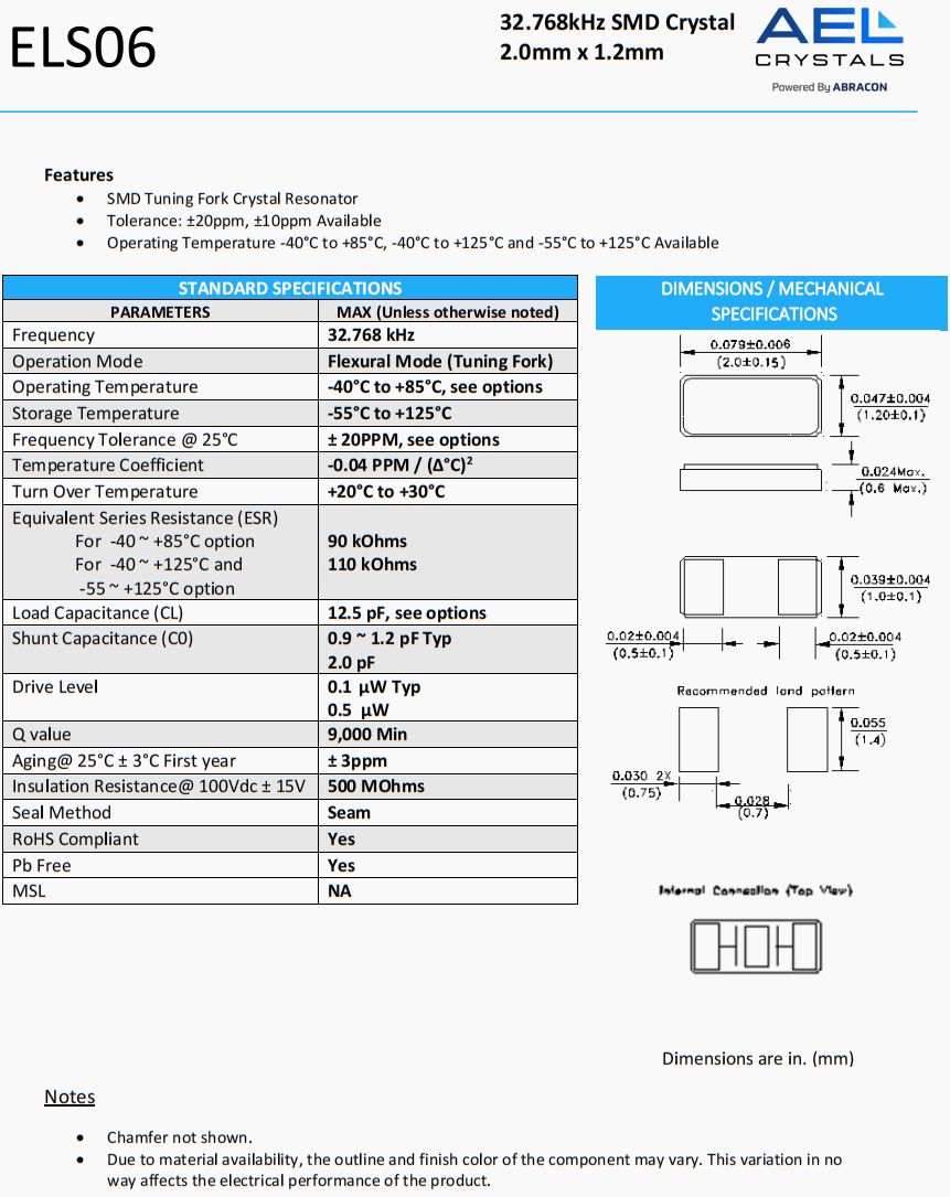 ELS06進口晶振,AEL低損耗晶體,ELS06-32.768kHz-9-T車載多媒體晶振