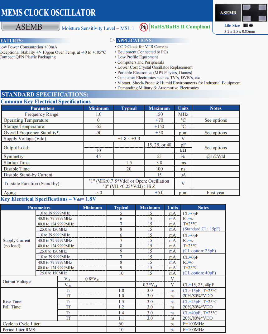 ASEMB-8.000MHZ-XY-T | Abracon晶振 | ASEMB | XO | 8 MHz | 1.8V ~ 3.3V | ±10ppm |