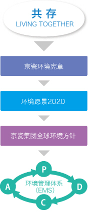 京瓷集團在“共存(LIVING TOGETHER)”這一理念的指導下,為構(gòu)建低碳社會、循環(huán)型社會、與自然共存的社會,制定了《京瓷環(huán)境憲章》,其中規(guī)定了環(huán)保產(chǎn)品開發(fā)、節(jié)能、防止全球變暖、節(jié)約資源、削減廢棄物、化學物質(zhì)的合理管理、保護生物多樣性等綜合性的環(huán)保措施.