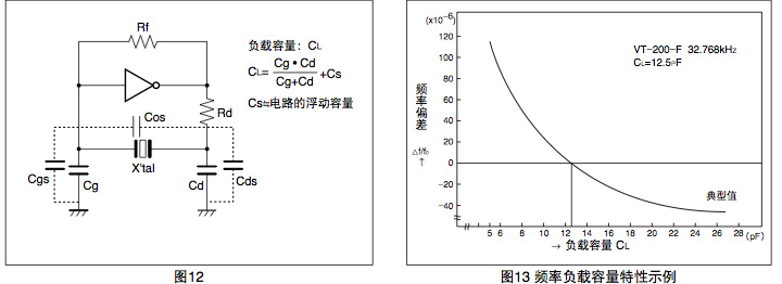 負(fù)載容量 (CL) 是用來決定在振蕩電路中晶振頻率的參數(shù),從加在振蕩電路中晶振兩端的電容可知負(fù)載容量(參閱圖12). 因振蕩電路的負(fù)載容量的不同,晶振的頻率會相應(yīng)地產(chǎn)生變動.為了獲得目標(biāo)的頻率精度,必須使晶振與負(fù)載容量相匹 配.在使用時,請根據(jù)相應(yīng)晶振的負(fù)載容量,將振蕩電路的負(fù)載容量設(shè)定為與其相符.