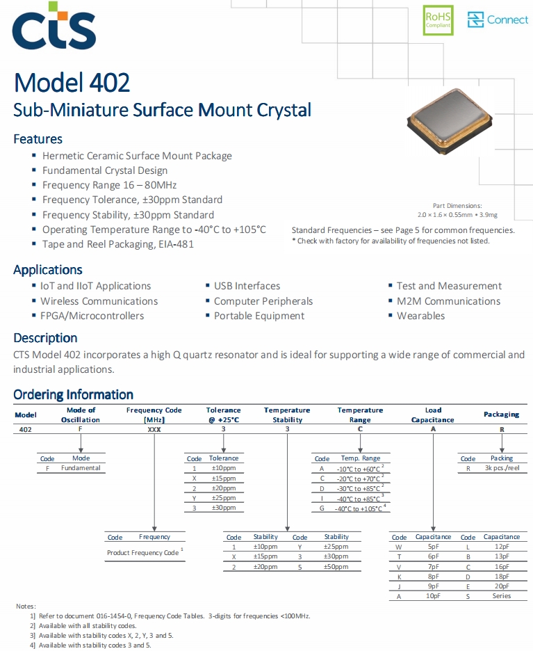 402F160XXCLR | CTS晶振 | 402 | MHz Crystal | 16MHz |