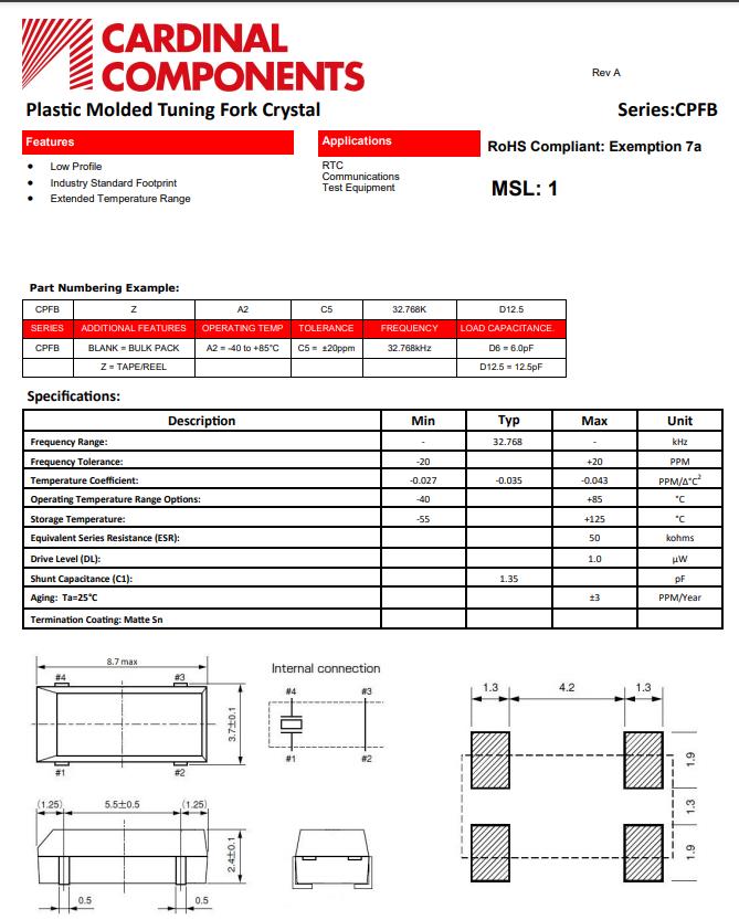 CPFBZ-A2C4-32.768KD12.5 | Cardinal晶振 | CPFB | 32.768kHz | 12.5pf | 10ppm | 50 kOhm | -40°C ~ 85°C |