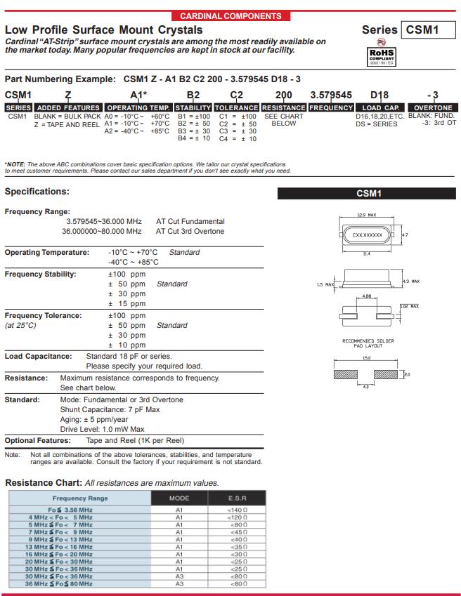 CSM1Z-A0B2C3-80-13.5D18 | Cardinal晶振 | CSM1 | 13.5MHz | ±50ppm | 80 Ohm | -10°C ~ 60°C |