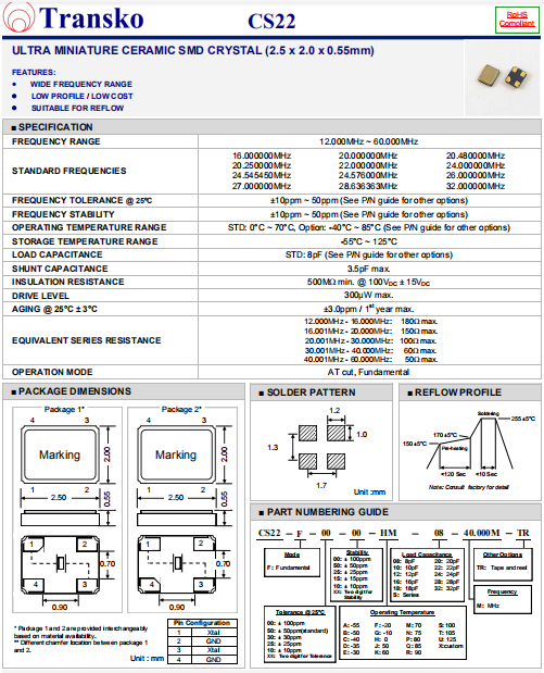 Transko晶振 | 單位 | CS22晶振 | 石英晶振基本條件 |