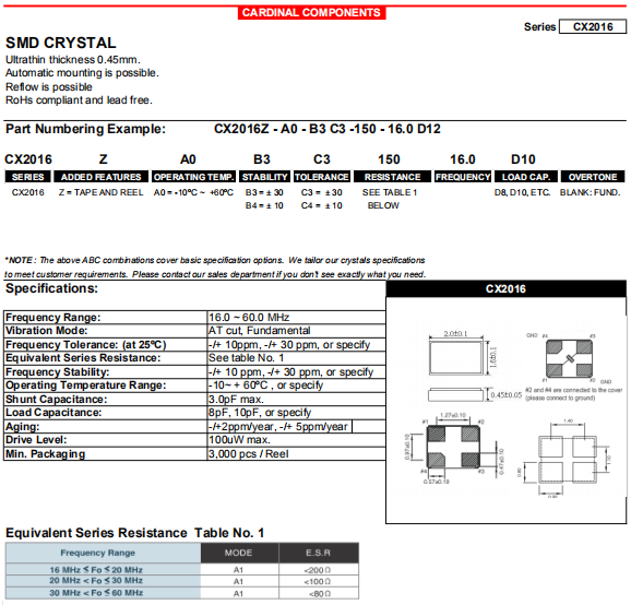 Cardinal晶振 | 單位 | CX2016晶振 | 石英晶振基本條件 |