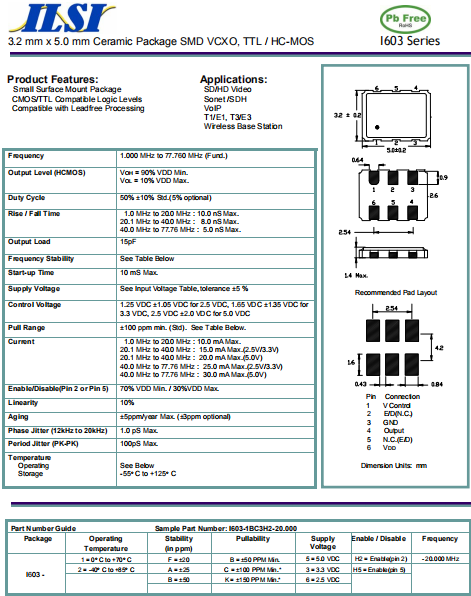 ILSI晶振,I603晶振,VCXO晶振.有源晶振,是只晶體本身起振需要外部電壓供應,起振后可直接驅動CMOS 集成電路,產品本身已實現與薄型IC(TSSOP封裝,TVSOP封裝)同樣的1mm厚度,斷開時的消費電流是15 µA以下,編帶包裝方式可對應自動搭載及IR回流焊接(無鉛對應)產品有幾種電壓供選1.8V,2.5V,3V3.3V,5V,以應對不同IC產品需要.