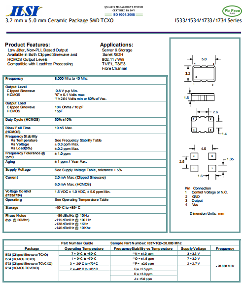 ILSI晶振,I733晶振,壓控溫補振蕩器.普通石英晶振,外觀完全使用金屬材料封裝的,產品本身采用全自動石英檢測儀,以及跌落,漏氣等苛刻實驗.產品本身具有高穩(wěn)定性,高可靠性的石英晶體振蕩器,焊接方面支持表面貼裝,外觀采用金屬封裝,具有充分的密封性能,晶振本身能確保其高可靠性,采用編帶包裝,可對應產品應用到自動貼片機告訴安裝,滿足無鉛焊接的高溫回流溫度曲線要求.