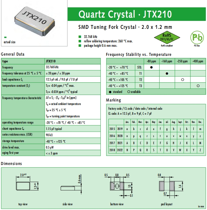 JAUCH晶振,JTX210晶振,石英晶體諧振器.32.768K系列具有超小型,薄型,質地輕的表面貼片音叉型石英晶體諧振器,晶振產品本身具備優(yōu)良的耐熱性,耐環(huán)境特性,在辦公自動化,家電領域,移動通信領域可發(fā)揮優(yōu)良的電氣特性,符合無鉛標準,滿足無鉛焊接的回流溫度曲線要求,金屬外殼的石英晶振使得產品在封裝時能發(fā)揮比陶瓷晶振外殼更好的耐沖擊性能.