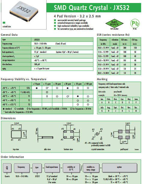 JAUCH晶振,JXS32晶振,高質(zhì)量石英晶振.貼片石英晶振最適合用于車載電子領(lǐng)域的小型表面貼片石英晶體諧振器.也可對應(yīng)有高可靠性要求的引擎控制用CPU的時(shí)鐘部分簡稱為時(shí)鐘晶體振蕩器,在極端嚴(yán)酷的環(huán)境條件下也能發(fā)揮穩(wěn)定的起振特性,產(chǎn)品本身具有耐熱,耐振,耐撞擊等優(yōu)良的耐環(huán)境特性,滿足無鉛焊接的回流溫度曲線要求,符合AEC-Q200標(biāo)準(zhǔn).
