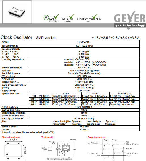 Geyer晶振,KXO-V96晶振,時鐘有源振蕩器.貼片式石英晶體振蕩器,低電壓啟動功率,并且有多種電壓供選擇,比如有1.8V,2.5V,3.3V,3.8V,5V等,產品被廣泛應用于,平板筆記本,GPS系統,光纖通道,千兆以太網,串行ATA,串行連接SCSI,PCI-Express的SDH / SONET發射基站等領域.符合RoHS/無鉛.