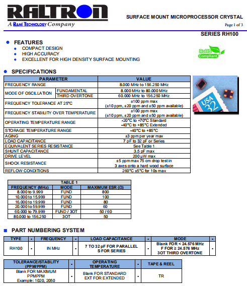 Raltron晶振 | 單位 | RH100晶振 | 石英晶振基本條件 |