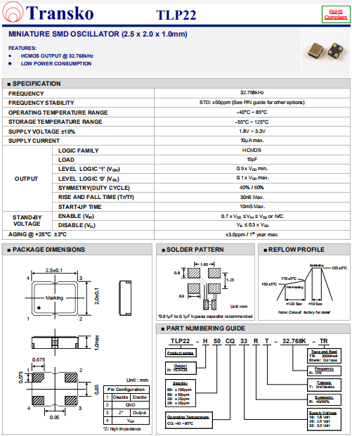 Transko晶振,TLP22晶振,貼片有源晶振.有源晶振,是只晶體本身起振需要外部電壓供應(yīng),起振后可直接驅(qū)動(dòng)CMOS 集成電路,產(chǎn)品本身已實(shí)現(xiàn)與薄型IC(TSSOP封裝,TVSOP封裝)同樣的1mm厚度,斷開時(shí)的消費(fèi)電流是15 µA以下,編帶包裝方式可對(duì)應(yīng)自動(dòng)搭載及IR回流焊接(無鉛對(duì)應(yīng))產(chǎn)品有幾種電壓供選1.8V,2.5V,3V3.3V,5V,以應(yīng)對(duì)不同IC產(chǎn)品需要.
