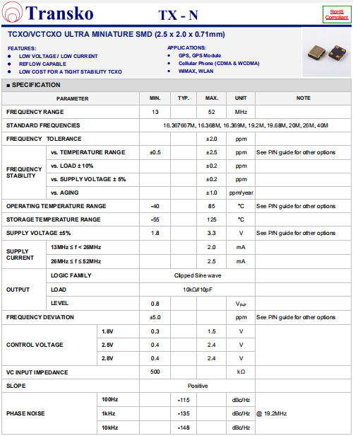 Transko晶振,TX-N晶振,低電壓振蕩器.有源晶振,是只晶體本身起振需要外部電壓供應,起振后可直接驅動CMOS 集成電路,產品本身已實現與薄型IC(TSSOP封裝,TVSOP封裝)同樣的1mm厚度,斷開時的消費電流是15 µA以下,編帶包裝方式可對應自動搭載及IR回流焊接(無鉛對應)產品有幾種電壓供選1.8V,2.5V,3V3.3V,5V,以應對不同IC產品需要.