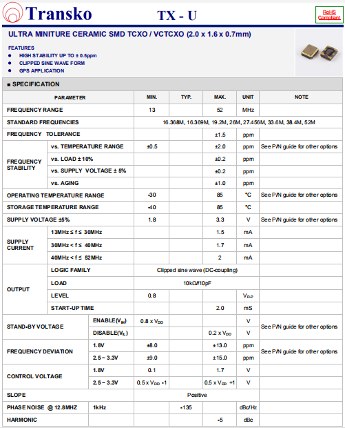 Transko晶振,TX-U晶振,溫度補(bǔ)償晶振.貼片晶振本身體積小,超薄型石英晶體振蕩器,特別適用于有目前高速發(fā)展的高端電子數(shù)碼產(chǎn)品,因?yàn)榫д癖旧硇⌒突枨蟮氖袌?chǎng)領(lǐng)域,小型,薄型是對(duì)應(yīng)陶瓷振蕩器(偏差大)和普通的石英晶體振蕩器(偏差小)的中間領(lǐng)域的一種性價(jià)比較出色的產(chǎn)品.產(chǎn)品廣泛用于筆記本電腦,無線電話,衛(wèi)星導(dǎo)航HDD, SSD, USB, Blu-ray等用途,符合無鉛焊接的高溫回流焊曲線特性.