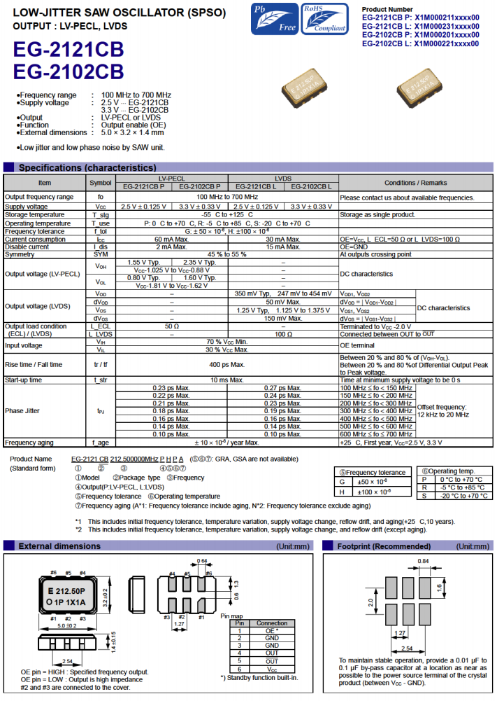 X1M0002110003 | EG-2121CB | 156.250000 MHz | 5.00 x 3.20 x 1.40 mm | LV-PECL | 2.375 to 2.625 V |