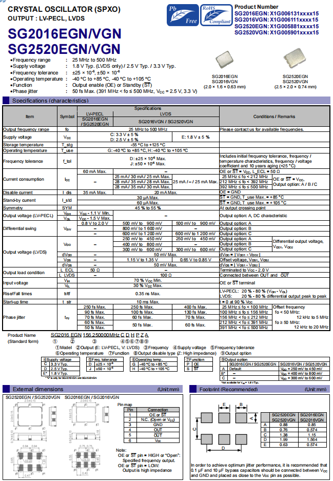 X1G0059010001 | SG2520VGN | 156.250000 MHz | 2.50 x 2.00 x 0.84 mm | LVDS | 3.135 to 3.465 V | -40 to 85 °C |