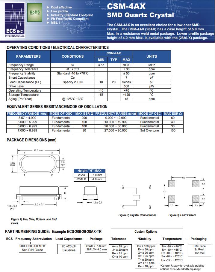 ECS-40-20-28AX-TR | CSM-4AX | 4MHz | ±30ppm | 20pF | -10°C ~ 70°C | HC49/US |