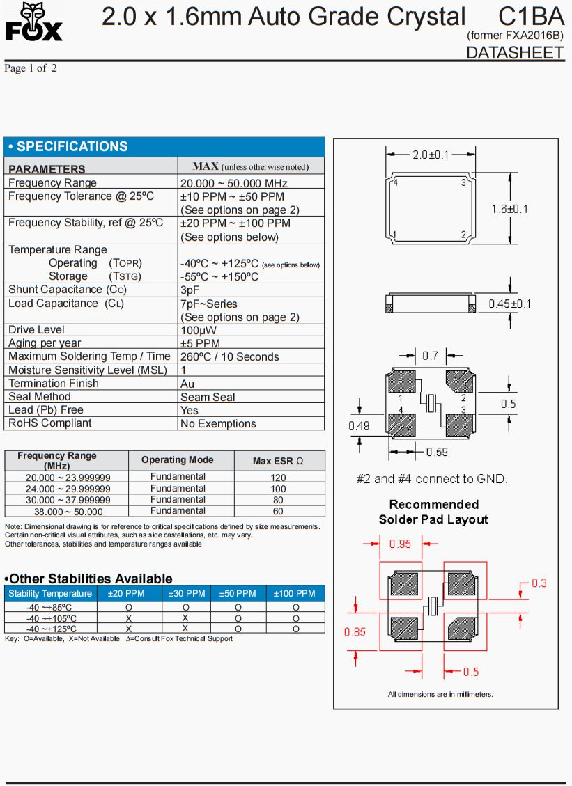 FOX原廠編碼 | 生產(chǎn)商 | 型號 | 頻率 | 頻率穩(wěn)定度 | 頻率容差 |
