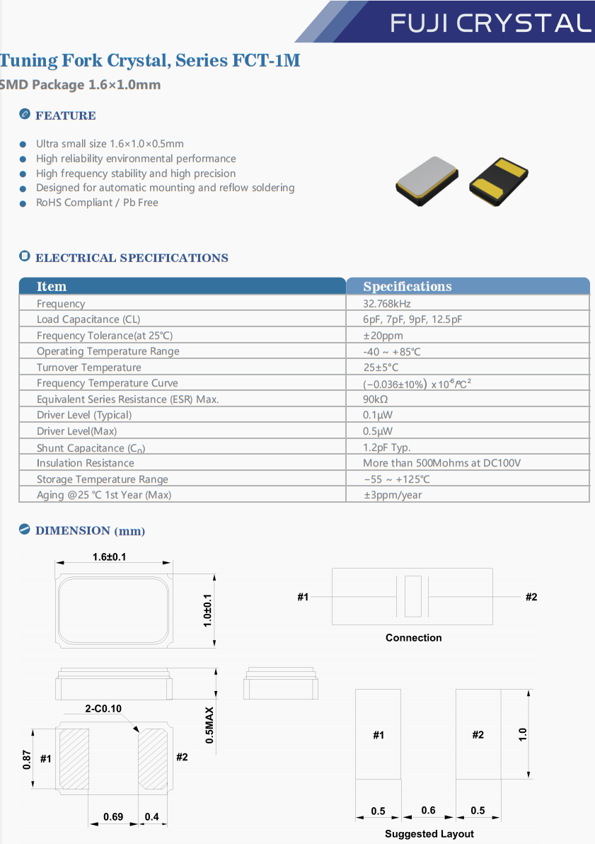 FCT1M032768C5P1 | Fuji晶振 | FCT-1M | 32.768 kHz | 12.5pF | -10°C ~ 60°C |