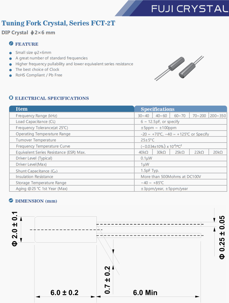 FCT2T03276806D1 | Fuji晶振 | FCT-2T | 32.768 kHz | 6pF | -10°C ~ 70°C |