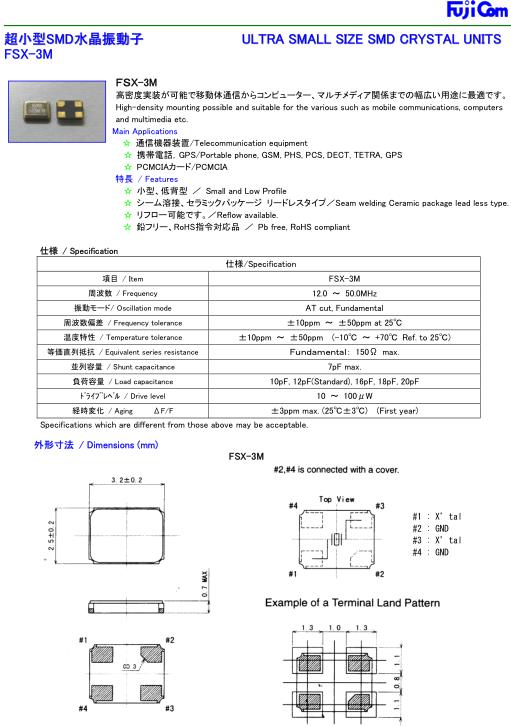 Fujicom晶振,FSX-3M四腳貼片晶振,SMD水晶振動子,超小型表面貼片型石英SMD晶振,最適合使用在汽車電子領(lǐng)域中,也是特別要求高可靠性的引擎控制用CPU的時鐘部分.低頻晶振可從7.98MHz起對應(yīng),小型,超薄型具備強防焊裂性,石英晶體在極端嚴酷的環(huán)境條件下也能發(fā)揮穩(wěn)定的起振特性,產(chǎn)品本身具有耐熱,耐振,耐撞擊等優(yōu)良的耐環(huán)境特性,滿足無鉛焊接以及高溫回流溫度曲線要求,符合AEC-Q200標準.