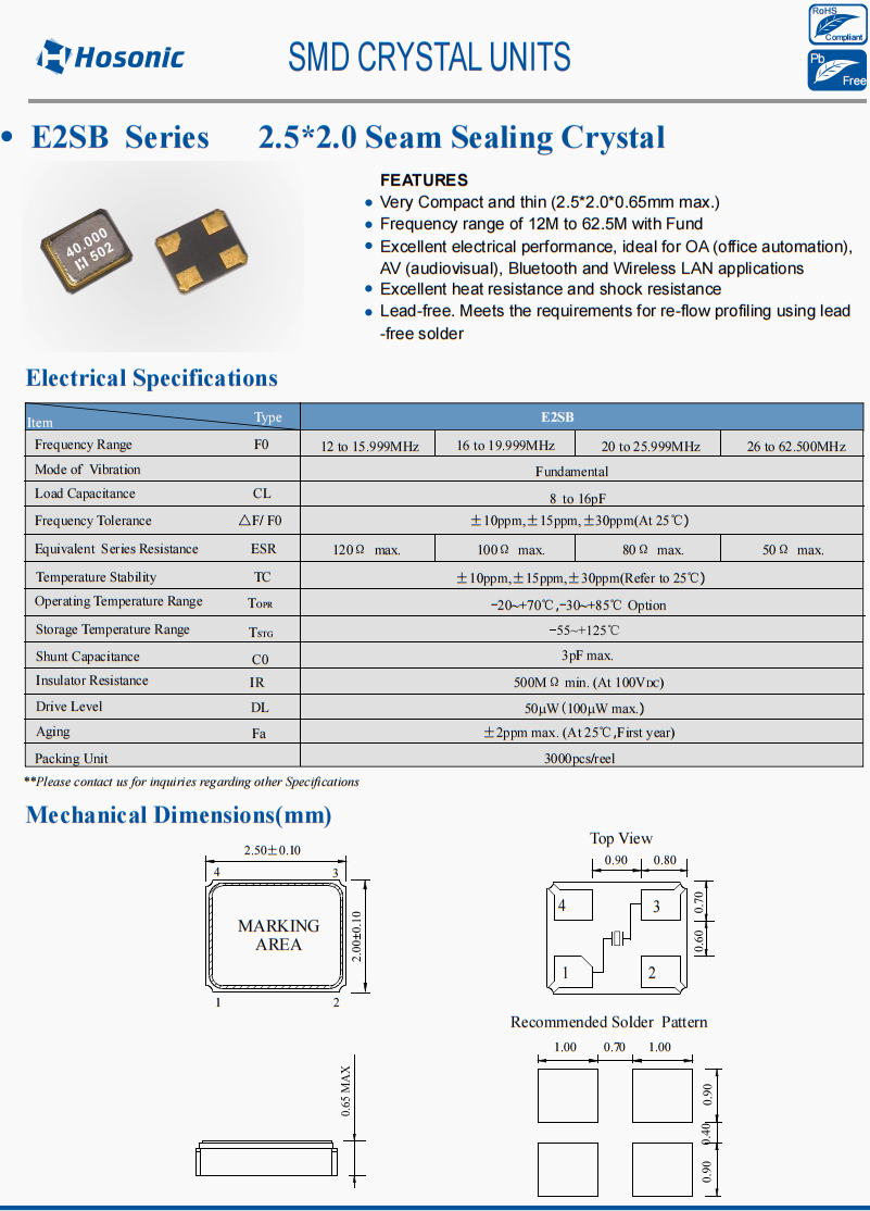 E2SB40.0000F10E12 | Hosonic晶振 | E2SB | 40MHz | 10pF | ±10ppm | ±10ppm | 2.5 x 2 x 0.56 mm |