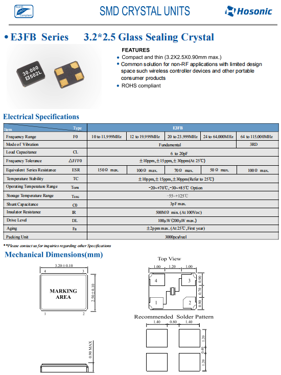 Hosonic進口晶振,E3FB24.0000F18E33,6G無線應用晶振參數表