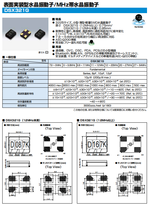 KDS晶振 | 7AD01200A1R | DSX321G | 3225 | 12.000MHZ | |