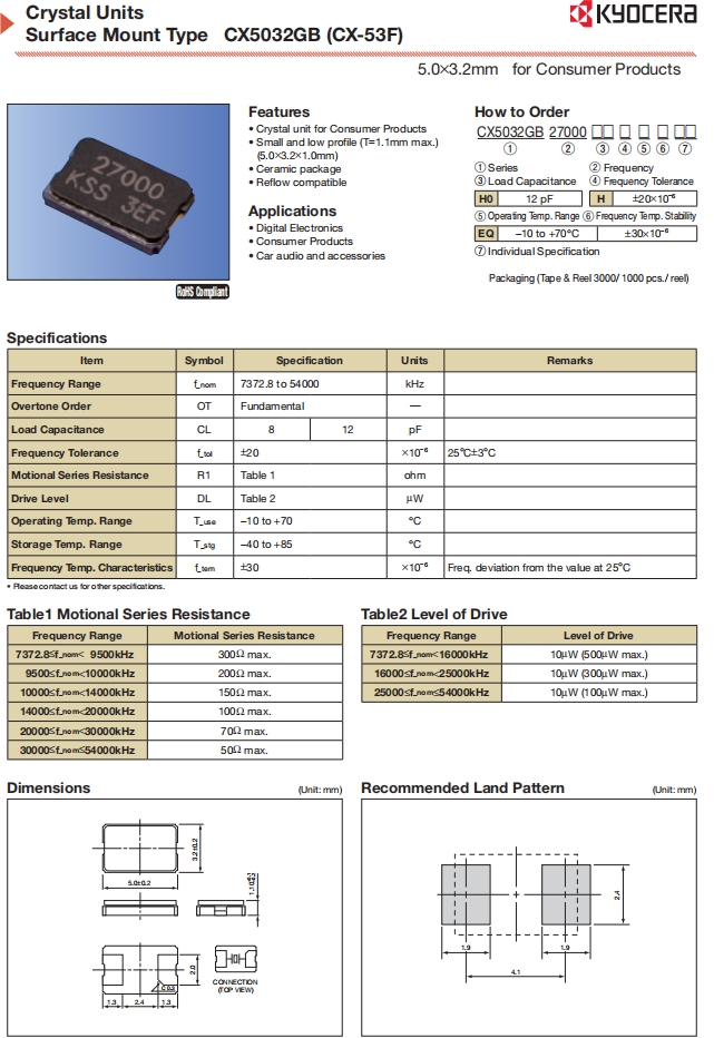 CX5032GB27000H0PESZZ | AVX Corp/Kyocera Corp | CX5032GB, Kyocera | MHz Crystal | 27MHz | -10°C ~ 70°C |