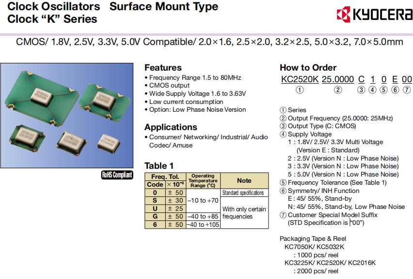 KC2520K25.0000C1GE00 | Kyocera有源振蕩器 | KC2520K, Kyocera | 25MHz | 1.6 V ~ 3.63 V | -40°C ~ 85°C |