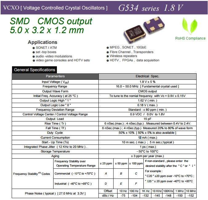 MERCURY晶振,壓控晶振,G534晶振,瑪居禮有源晶體振蕩器.VCXO是指這款晶體產品控制功能只有單壓控也就是電壓控制功能,產品本身頻率精度可以隨著電壓搞定起伏來自動調整頻率,使產品永遠控制在一定的頻率范圍,壓控晶振(VCXO)壓控石英晶體振蕩器基本解決方案,PECL輸出,輸出頻率60 MHz到200 MHz之間,出色的低相位噪聲和抖動,三態功能,應用:SDH/ SONET,以太網,基站,筆記本晶振應用, VCXO,壓控晶體應用:調制解調器,ADSL網絡控制器,無線基站,程控交換設備智能手機,筆記本晶振等.