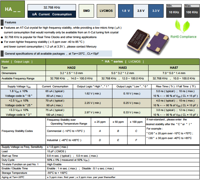 MERCURY晶振,32.768K有源晶振,HA57振蕩器.無論是溫補晶體也好,壓控晶振也罷,產品均采用了,離子刻蝕調頻技術,比目前一般使用的真空蒸鍍方式調頻,主要在產品參數有以下提升:1.微調后調整頻率能控制在±2ppm,一般只能保持在±5ppm;2.產品的激勵功率相關性參數有大幅提升;3.產品的長期老化率可保證在±2ppm之內.