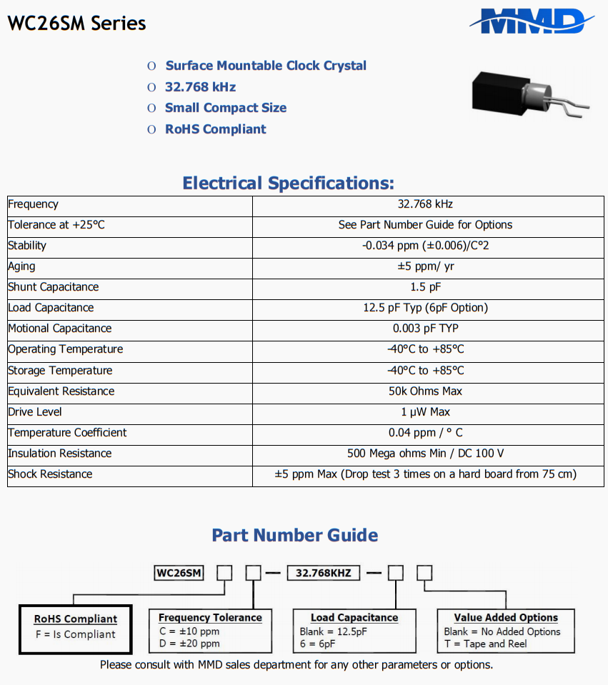 WC26SMFC-32.768KHZ-T | MMD | WC26SM | -40°C ~ 85°C | 32.768 kHz | ±10ppm | 12.5 pF | |