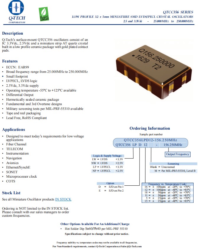 QTCC356LWD12-125.000MHz,LVDS差分晶振,6G以太網晶振 ,Q-TECH歐美晶振,QTCC356石英晶體振蕩器,QTCC356LWD12-125.000MHz晶振,頻率125MHz,電壓3.3V,工作溫度-40~85°C,頻率穩定性100ppm,耐高溫晶振,LVDS差分晶振,無鉛環保晶振,光纖通道晶振,電信晶振,儀器設備晶振,GPS導航晶振,航空電子設備晶振,6G以太網晶振,微處理器時鐘應用晶振.