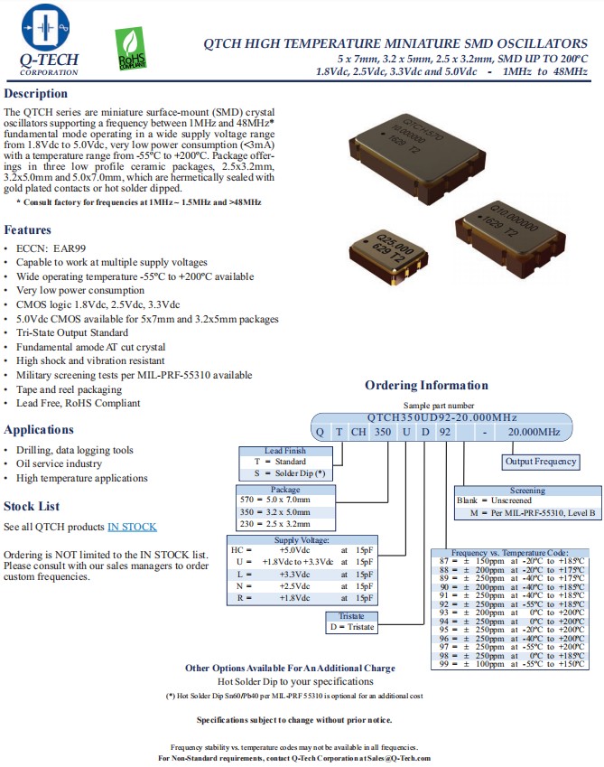 QTCH230LD92-32.000MHz|3225mm高溫應用晶振|Q-Tech美國晶振,型號QTCH230,編碼QTCH230LD92-32.000MHz,是美國Q-Tech晶振公司旗下的一款微型表面貼裝(SMD)晶體振蕩器,支持頻率在1MHz至48MHz之間*基模,工作在1.8Vdc至5.0Vdc的寬電源電壓范圍內,功耗極低(<3mA),溫度范圍為-55ºC至+200ºC,尺寸3225mm,是高溫應用晶振,可用于鉆井、數(shù)據(jù)測井工具,石油服務行業(yè)等領域.
