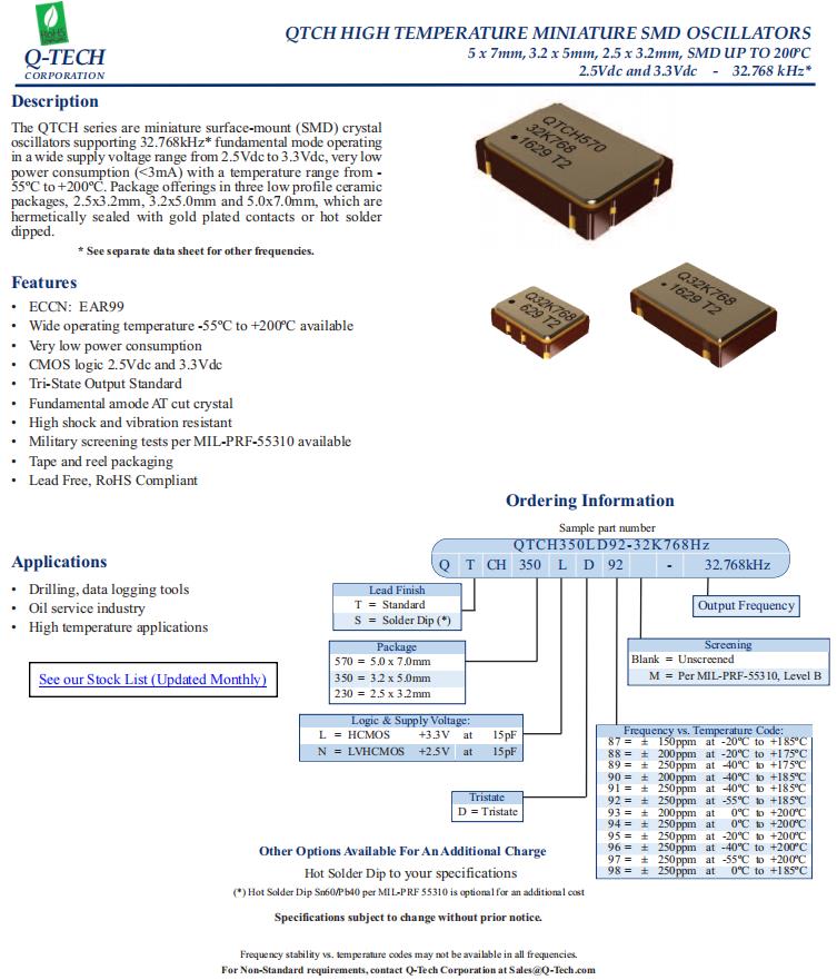 QTCH350LD92-32K768Hz,5032mm有源晶振,6G基站晶振,Q-Tech晶振,型號QTCH350,編碼QTCH350LD92-32K768Hz,是微型表面貼裝SMD晶體,支持32.768kHz*基模操作的石英晶體振蕩器,在2.5Vdc到3.3Vdc的寬電源電壓范圍內,有非常低的功耗(< 3mA),溫度范圍-55℃至+200℃,具有高抗沖擊和抗振動性,6G基站晶振,鉆井、數據記錄工具晶振,高溫應用晶振.