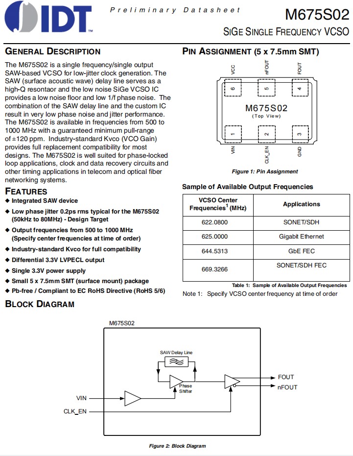 M675S02-ATT | IDT晶振 | OSC VCSO 699.5175MHZ LVPECL SMD | M675S02 |