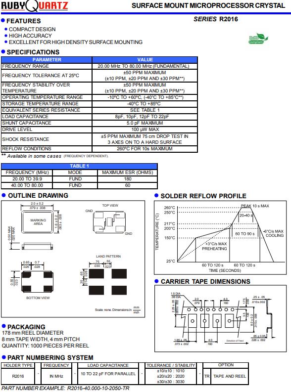 R2016貼片諧振器,Rubyquartz高質量晶體,R2016-20.000-10-2050-TR晶振,貼片晶振本身體積小,超薄型石英晶體振蕩器,特別適用于有目前高速發展的高端電子數碼產品,因為晶振本身小型化需求的市場領域,小型,薄型是對應陶瓷振蕩器(偏差大)和普通的石英晶體振蕩器(偏差小)的中間領域的一種性價比較出色的產品.產品廣泛用于筆記本電腦,無線電話,衛星導航SSD,USB,Blu-ray等用途,符合無鉛焊接的高溫回流焊曲線特性.