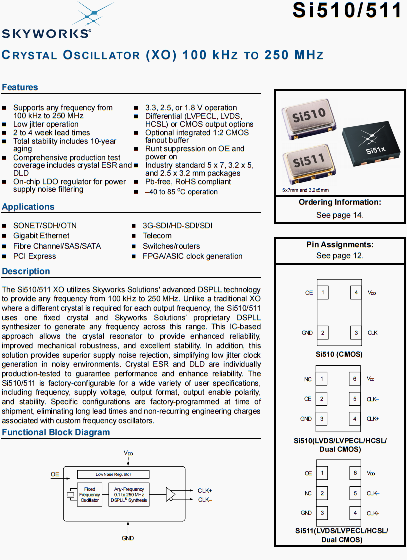 510BCA125M000BAG | Skyworks晶振 | Si510 | XO | 125 MHz | LVDS | 3.3V | ±20ppm |