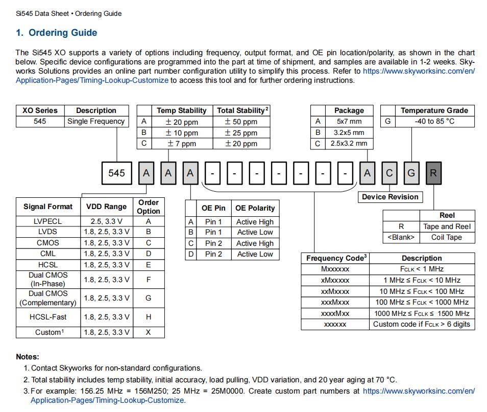SKYWORKS原廠編碼 | 生產(chǎn)商 | 型號(hào) | 頻率 | 輸出 | 電源電壓 | 頻率穩(wěn)定度 |