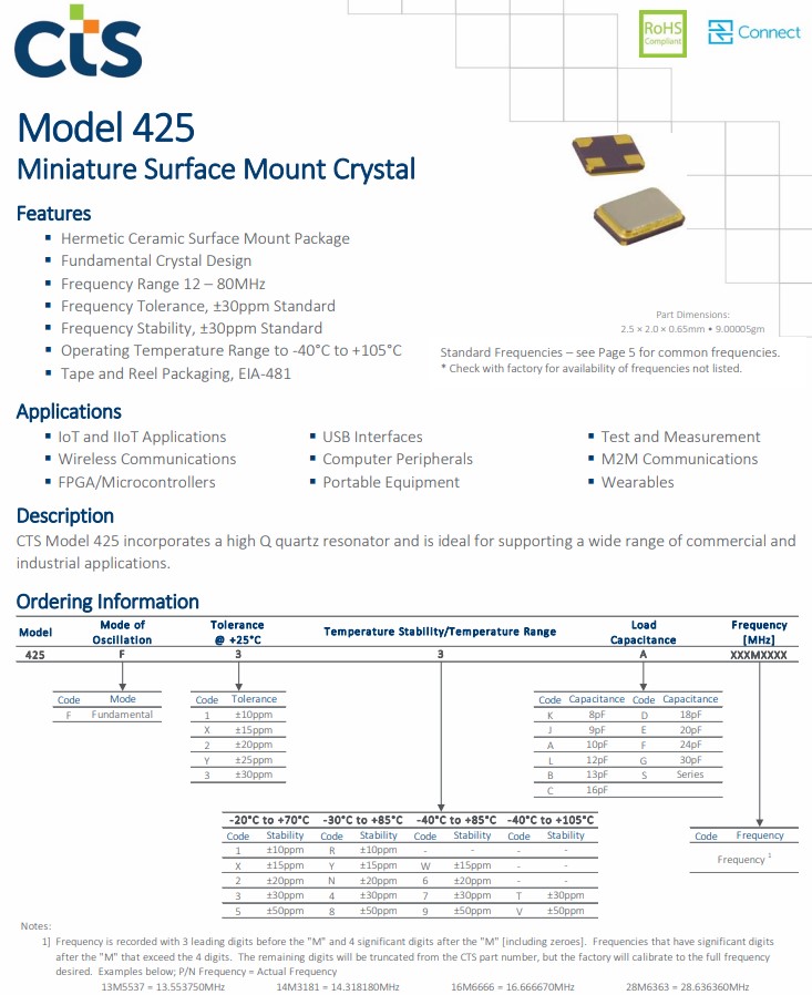425F11K020M0000 | CTS晶振 | 425 | MHz Crystal | 20MHz | 4-SMD, No Lead |