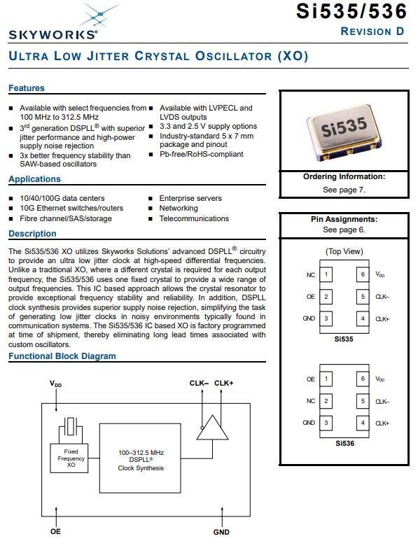 低抖動的時鐘晶體振蕩器是芯科專為企業(yè)服務(wù)器匠心打磨501AAA27M0000CAF,基于Si535/536 IC的XO是工廠編程的在裝運(yùn)時,因此消除了與定制石英晶體振蕩器,可從以下頻率中選擇100MHz至312.5MHz集成superior的第三代DSPLL抖動性能和高功率,電源噪聲抑制,頻率穩(wěn)定性比高3倍,基于SAW的振蕩器LVPECL和 LVDS輸出,3.3和2.5V電源選項,行業(yè)標(biāo)準(zhǔn)5 x 7毫米,封裝和引腳排列,無鉛/符合RoHS標(biāo)準(zhǔn),應(yīng)用:10/40/100G數(shù)據(jù)中心,10G以太網(wǎng)交換機(jī)/路由器,光纖通道/SAS/存儲,企業(yè)服務(wù)器,網(wǎng)絡(luò),電信.