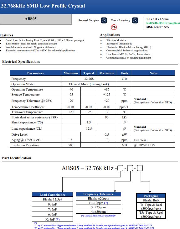 更多>>低輪廓超小型石英晶體ABS05-32.768KHZ-9-T用于藍(lán)牙低能量應(yīng)用