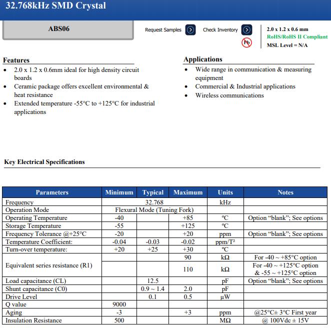 ABS06-32.768KHZ-T | Abracon晶振 | ABS06 | kHz Crystal (Tuning Fork) | 32.768kHz | 2-SMD, No Lead |