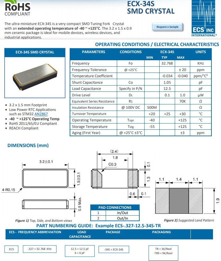 ECS-.327-12.5-34R-TR | ECScrystal | ECX-34R | 32.768kHz | -40°C ~ 85°C | 2-SMD, No Lead |