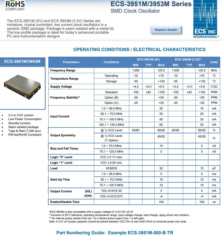 The ECS-3951M (5V) and ECS 3953M (3.3V) Series are miniature, crystal controlled, low current clock oscillators in a ceramic SMD package. Package is seam welded with a metal lid. The low profile package is ideal for today’s advanced portable PC and instrumentation designs.編碼ECS-3953M-250-B-TR是一款封裝為7050mm四腳貼片型的OCS晶振,XO時鐘晶體振蕩器,石英晶體振蕩器,頻率25.0000MHZ,輸出HCMOS,電壓3.3V,ECS- 3951m (5V)和ECS 3953M (3.3V)系列是微型,晶體控制,低電流時鐘振蕩器在一個陶瓷SMD封裝。包裝是與金屬蓋縫焊。低調的包裝是當今先進便攜的理想選擇PC和儀表設計。