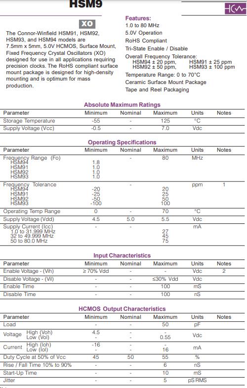 HSM93-020.0M | Connor-Winfield振蕩器 | HSM9 | 20MHz | 0°C ~ 70°C |