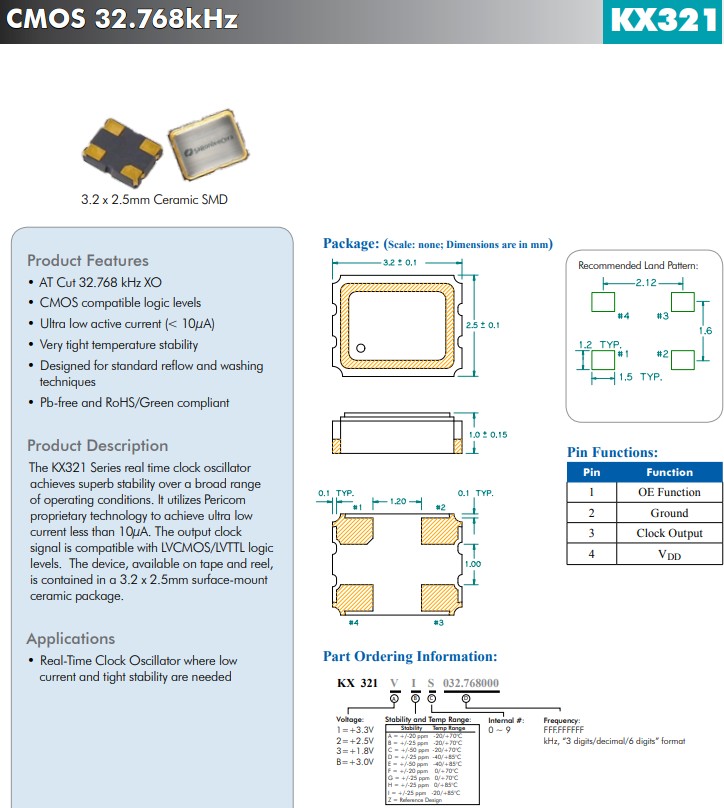 KX321系列實(shí)時(shí)時(shí)鐘振蕩器在廣泛的工作條件下實(shí)現(xiàn)了卓越的穩(wěn)定性。1.8V/2.5V/3.3V, 小體積晶振尺寸3.2x2.5mm, 32.768k,CMOS晶體振蕩器,它利用Pericom專有技術(shù)實(shí)現(xiàn)小于10μA的超低電流。輸出時(shí)鐘信號(hào)與 LVCMOS/LVTTL 邏輯電平兼容。該器件采用卷帶包裝,采用3.2x2.5mm表面貼裝陶瓷封裝。