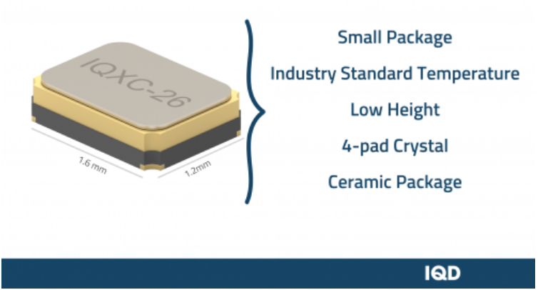IQD Crystal's ultra-small crystal oscillator, IQXC-26 is a 4-liner quartz crystal oscillator housed in a 1.6 x 1.2 x 0.4mm ceramic package with a sealed metal lid. This cover is grounded to reduce the effects of electromagnetic compatibility radiation. This makes the IQXC-26 ideal for use in all wireless based applications.